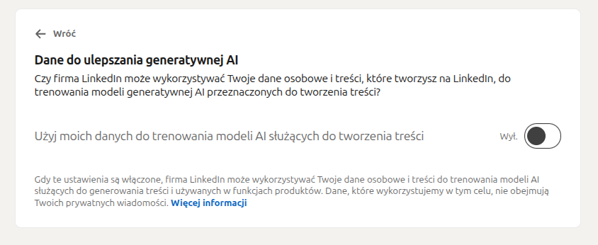 Skoro już wiesz, że LinkedIN buduje swoje AI. Używa do tego Twoich danych, czas na konkretne działanie. Domyślnie platforma zakłada, że zgadzasz się na udostępnianie swoich informacji. Jesteś automatycznie zapisany do programu treningowego, więc jeśli cenisz swoją prywatność, musisz samodzielnie wyłączyć tę opcję.